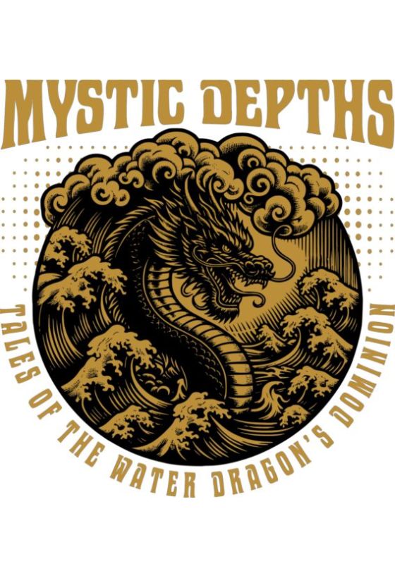 Χρυσός δράκος νερού με κύματα και σύννεφα. Κείμενα «Tales of the Water Dragon’s Dominion» και «Mystic Depths».