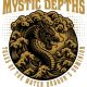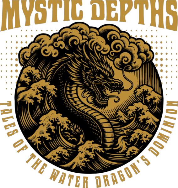 Χρυσός δράκος νερού με κύματα και σύννεφα. Κείμενα «Tales of the Water Dragon’s Dominion» και «Mystic Depths».