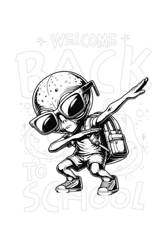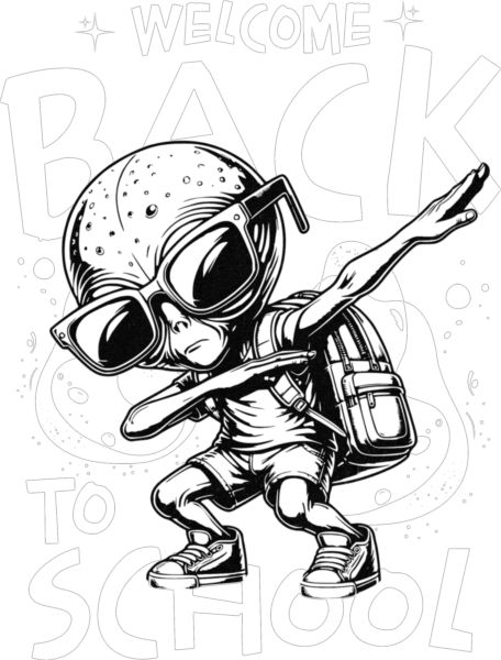 Εξωγήινος με γυαλιά/σακίδιο· «WELCOME BACK TO SCHOOL», grunge διάφανο φόντο.