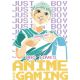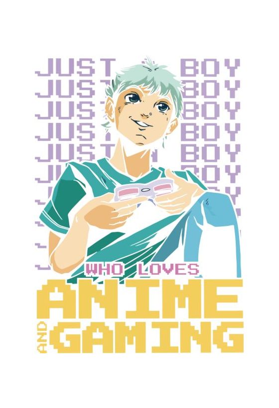 Anime αγόρι με γαλάζια μαλλιά, ροζ χειριστήριο, pixel κείμενο «JUST BOY» και «WHO LOVES ANIME AND GAMING».