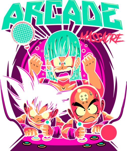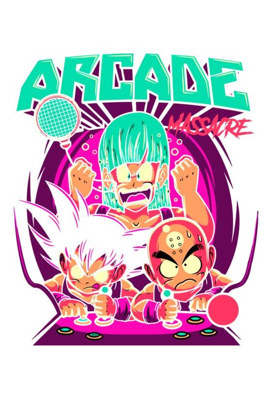 Dragon Ball: Bulma με μυγοσκόπηση, Goku και Krillin σε arcade game, επιγραφή «ARCADE MASSACRE».