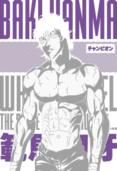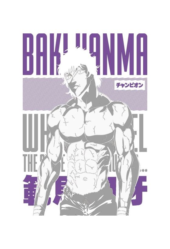 Baki Hanma σε μαύρο-λευκό-μωβ με επιγραφή «BAKI HANMA» και «Πρωταθλητής» στα ιαπωνικά.