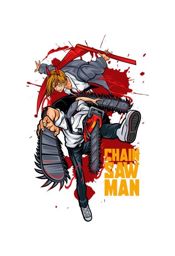 Denji (Chainsaw Man) σε υβριδική μορφή με αλυσοπρίονα σε κεφάλι και χέρια, μαύρο φόντο με κόκκινα πιτσιλίσματα, κείμενο «CHAINSAW MAN».