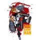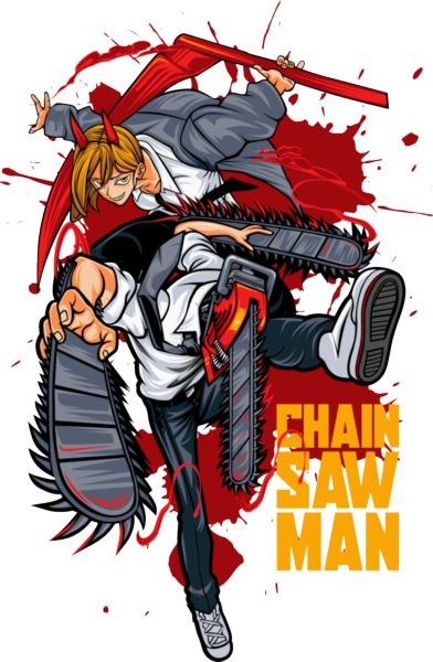 Denji (Chainsaw Man) σε υβριδική μορφή με αλυσοπρίονα σε κεφάλι και χέρια, μαύρο φόντο με κόκκινα πιτσιλίσματα, κείμενο «CHAINSAW MAN».