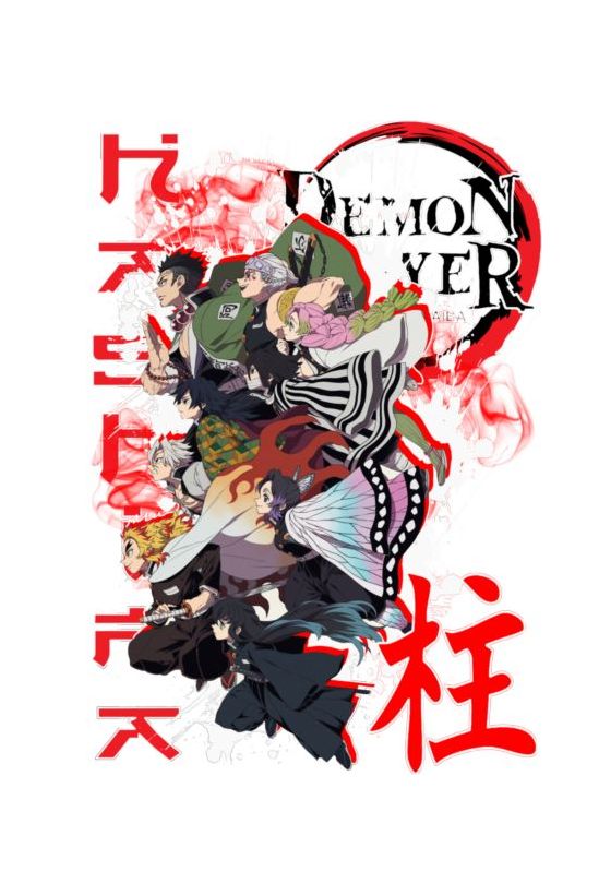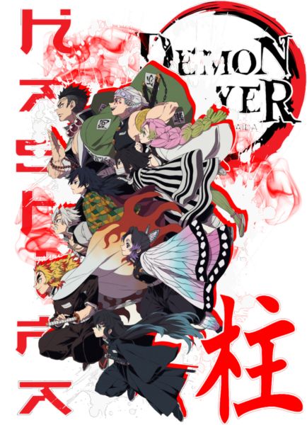 Όλοι οι Hashira (Demon Slayer), πόζες δράσης, μαύρο φόντο με καλλιγραφία.
