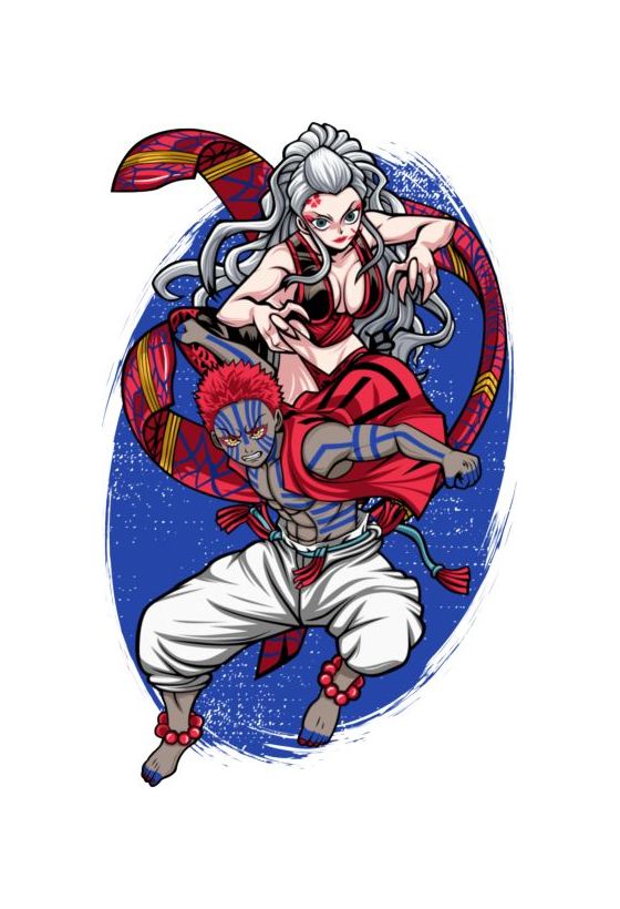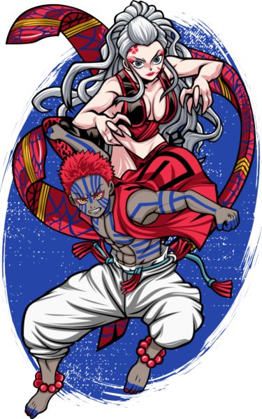 Daki και Gyutaro (Demon Slayer), μπλε/μαύρο φόντο, κόκκινο obi.