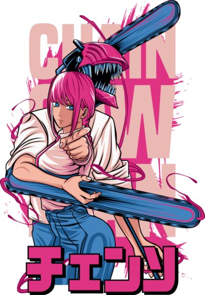 Makima (Chainsaw Man), φόντο με κείμενο «CHAINSAW», ροζ και ιαπωνικά γράμματα.
