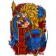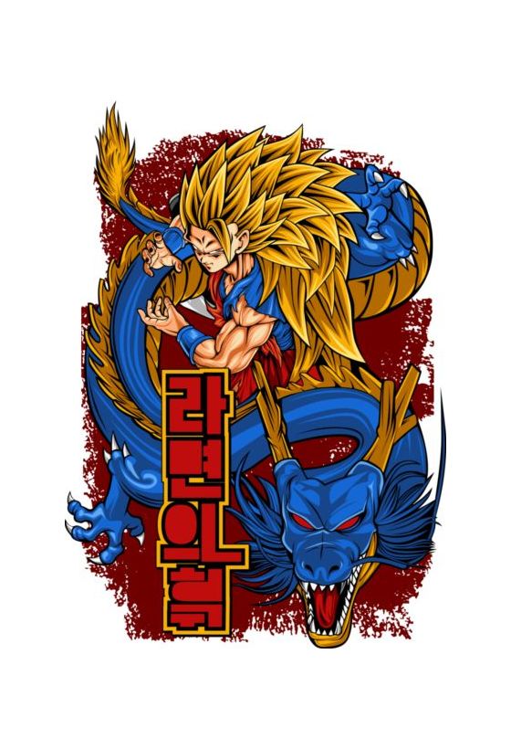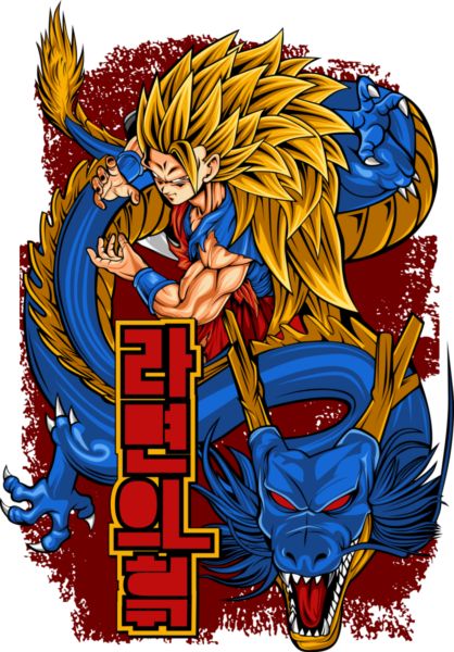 Super Saiyan 3 Goku με μπλε δράκο, κόκκινο/μαύρο φόντο και κορεάτικο κείμενο.