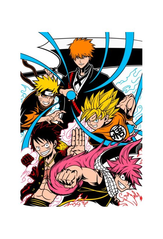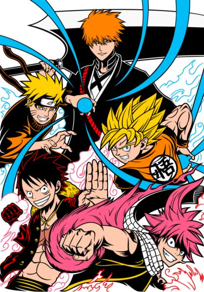Crossover anime με Goku, Luffy, Naruto, Ichigo, Natsu σε μαύρο φόντο.