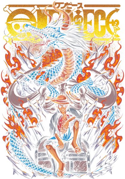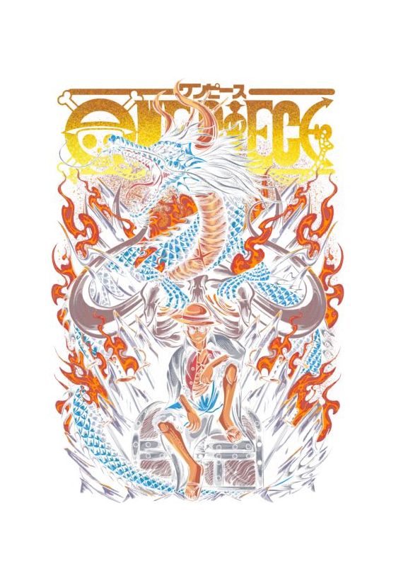 Luffy σε σεντούκι θησαυρού με δράκο και φλόγες, λογότυπο One Piece.