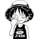 Ασπρόμαυρη εικονογράφηση του Luffy με ψάθινο καπέλο και φανελάκι, σε σκεπτική πόζα. Λεπτομέρειες: κείμενο «Tamago Jiken» και πουλί στο πουκάμισο.
