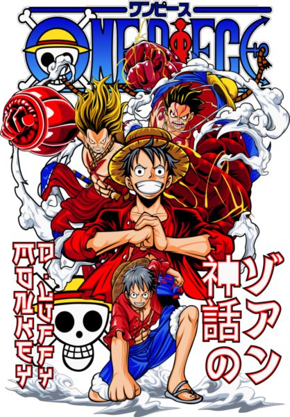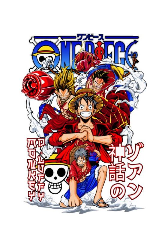 Luffy σε Gear 5 με καπνό, πλαισιωμένος από Gear 4 και Gear 2 εκδοχές, λογότυπο One Piece.