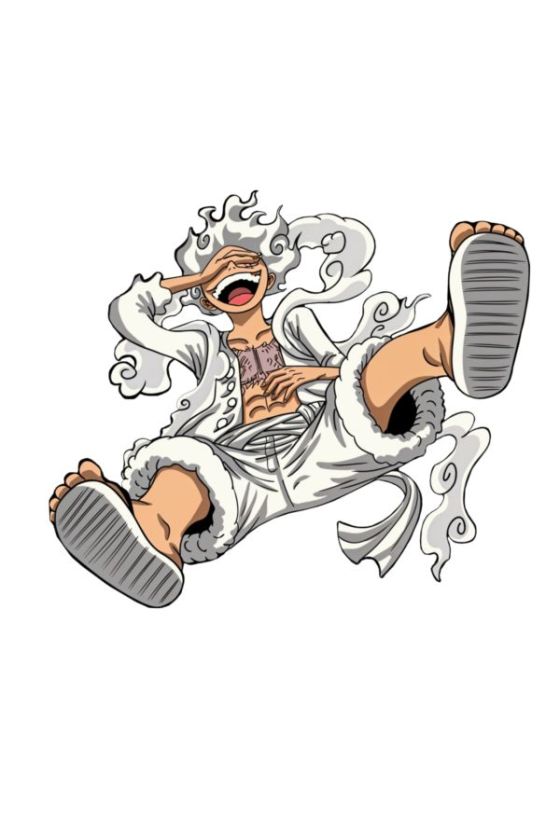 Εικονογράφηση του Monkey D. Luffy σε Gear 5, με λευκά μαλλιά σαν σύννεφα και άσπρη ενδυμασία. Δυναμική χαρούμενη πόζα, σε μαύρο φόντο.