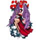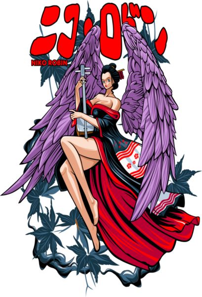 Σχέδιο του Nico Robin (One Piece) με μεγάλα μοβ φτερά, κιμονό με φλοράλ μοτίβα και παραδοσιακό shamisen.