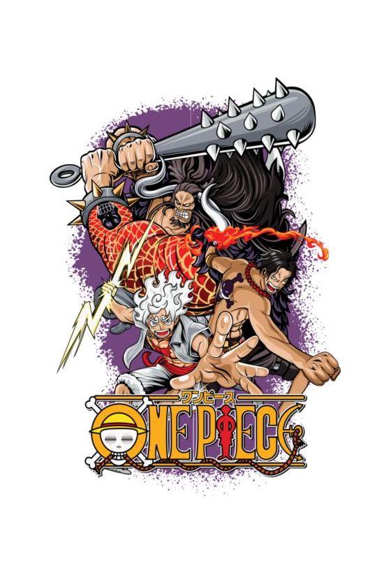 Δυναμική εικονογράφηση του Kaido, Luffy (Gear 5) και Ace από το One Piece, σε μάχη με εφέ φωτιάς και κεραυνών, σε σκούρο φόντο με λογότυπο One Piece.