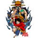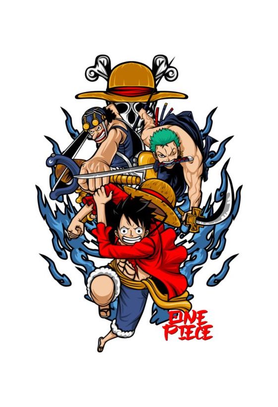 Εικονογράφηση One Piece με τους Luffy, Zoro και Usopp σε δυναμικές πόζες, με το λογότυπο One Piece στο φόντο.