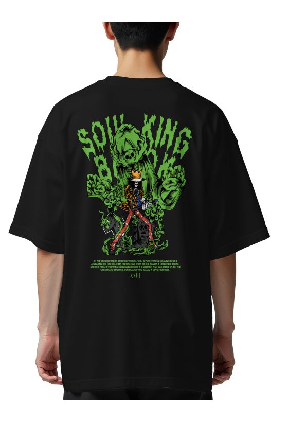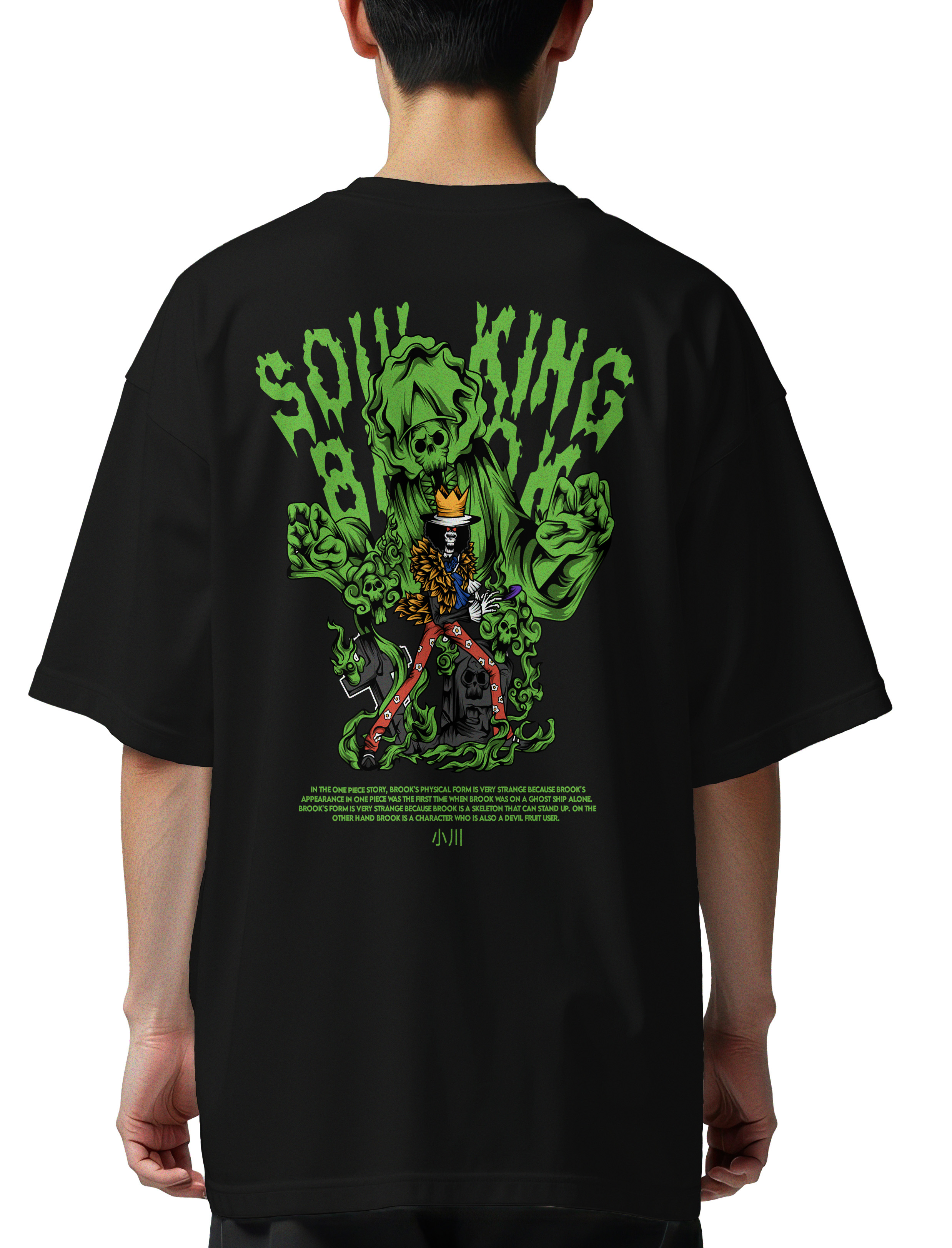 Σχέδιο του Brook (One Piece) με καπέλο-κορώνα και κοστούμι, περιτριγυρισμένο από πράσινη αύρα και σκελετικά στοιχεία.