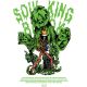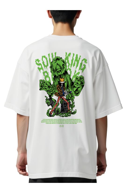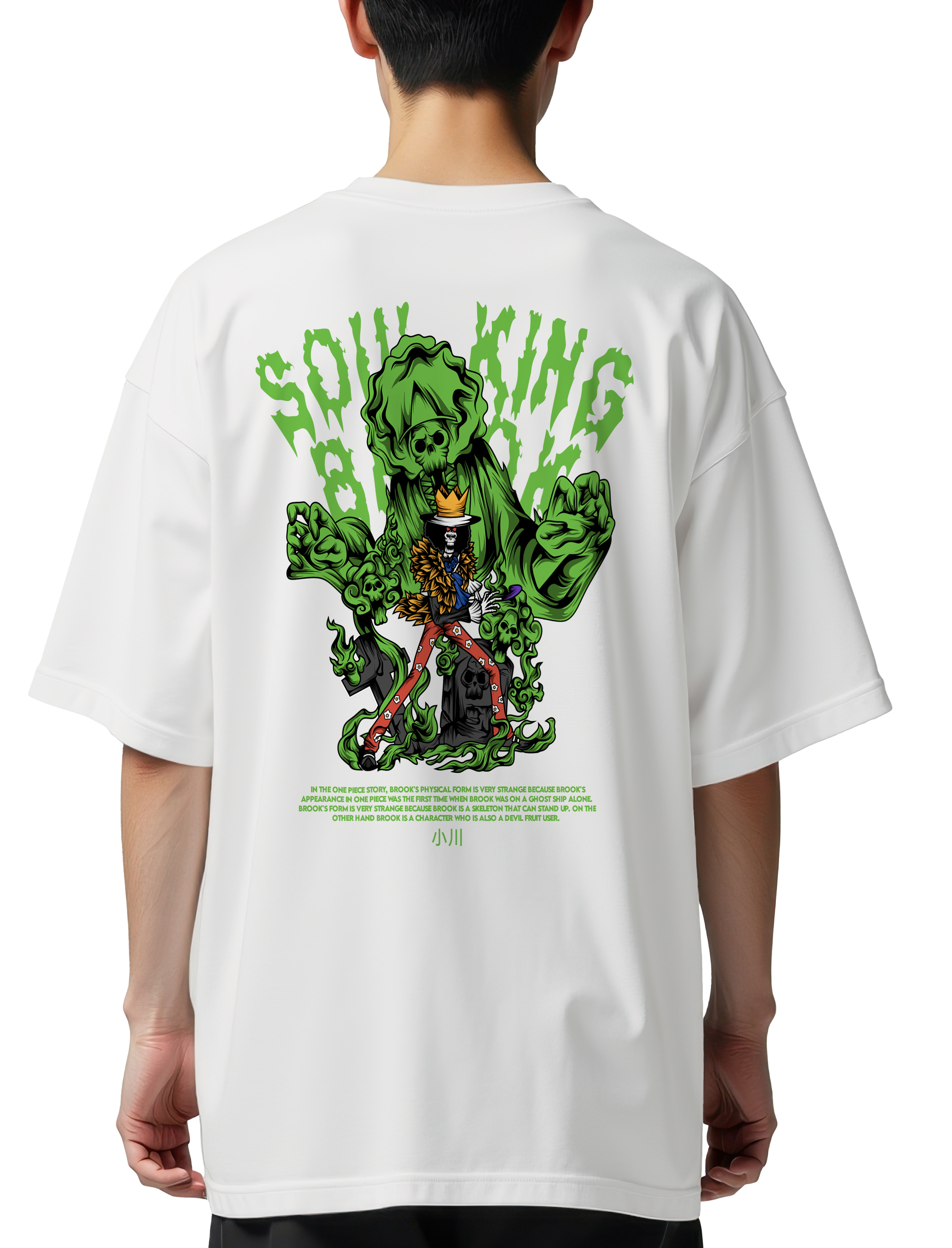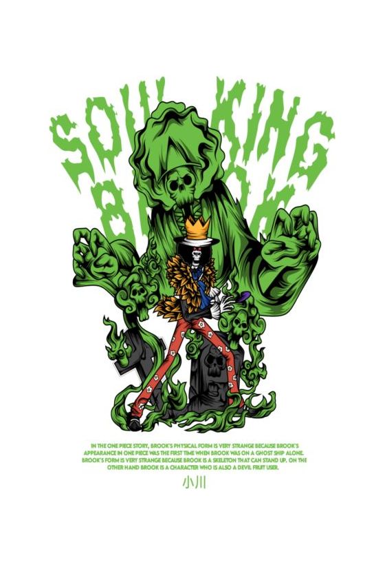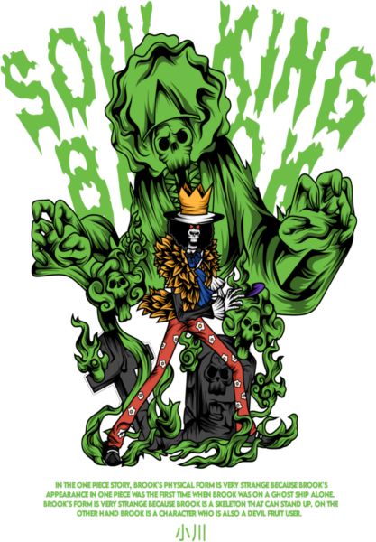 Σχέδιο του Brook (One Piece) με καπέλο-κορώνα και κοστούμι, περιτριγυρισμένο από πράσινη αύρα και σκελετικά στοιχεία.