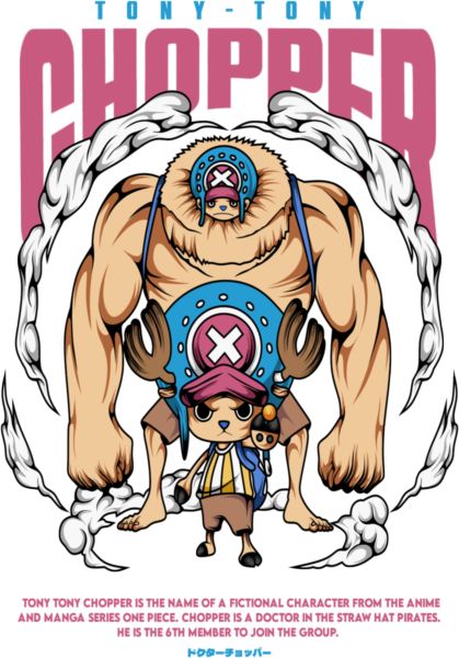 Σχέδιο με τον Tony Tony Chopper (One Piece) στις δύο μορφές του: μικρός με ροζ καπέλο και Monster Point με μπλε καπέλο.