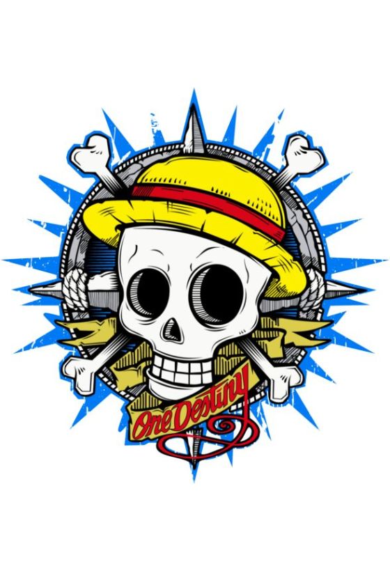 Κρανίο με ψάθινο καπέλο και χιαστί, σε μπλε φόντο με αστέρια. Χρυσό πανό με το κείμενο «One Destiny».