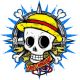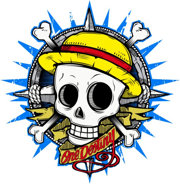 Κρανίο με ψάθινο καπέλο και χιαστί, σε μπλε φόντο με αστέρια. Χρυσό πανό με το κείμενο «One Destiny».