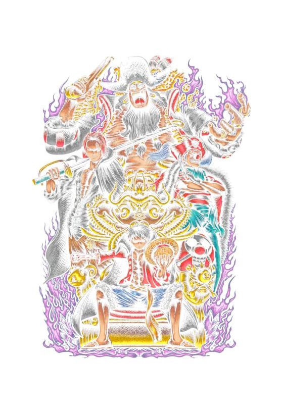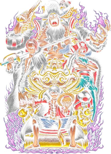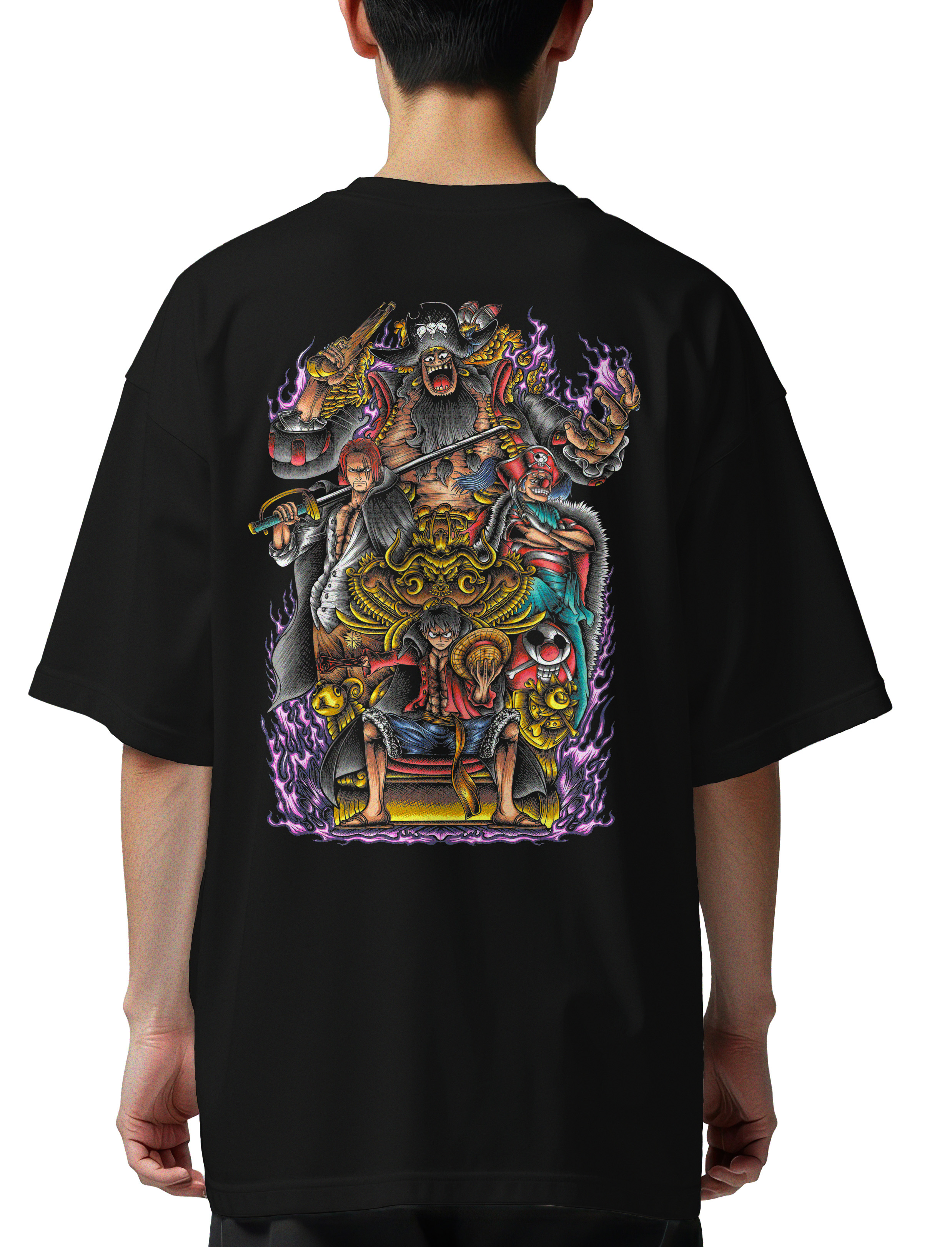 Εικονογράφηση One Piece με τον Luffy σε θρόνο και γύρω του Yonko (Blackbeard, Shanks, Buggy), σε σκοτεινό φόντο με μοβ φλόγες.