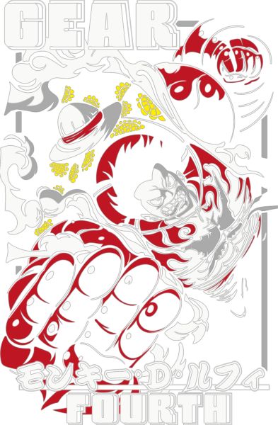 Ο Luffy σε Gear Fourth, μεγεθυσμένο σώμα, εφέ ατμού και Haki. Κόκκινοι και λευκοί τόνοι, με κείμενο «Gear Fourth».