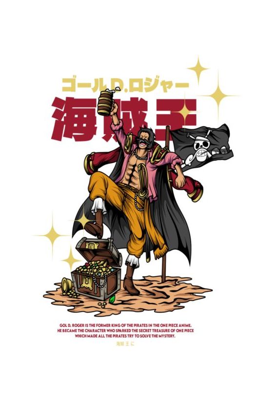 Σχέδιο του Gol D. Roger σε θριαμβευτική πόζα με σεντούκι θησαυρού και πειρατική σημαία, σε σκοτεινό φόντο με χρυσές λεπτομέρειες.