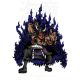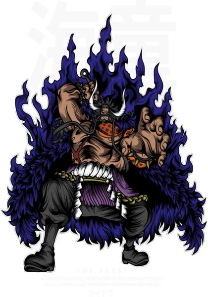 Σχέδιο του Kaido σε μορφή θηρίου με κέρατα, μυώδες σώμα και μωβ αύρα, με ιαπωνικό κείμενο στο φόντο.