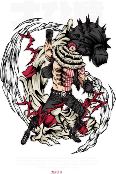 Εικονογράφηση της Charlotte Katakuri με γροθιά Mochi, ροζ μαλλιά και γούνινο γιακά, σε μάχιμη πόζα.