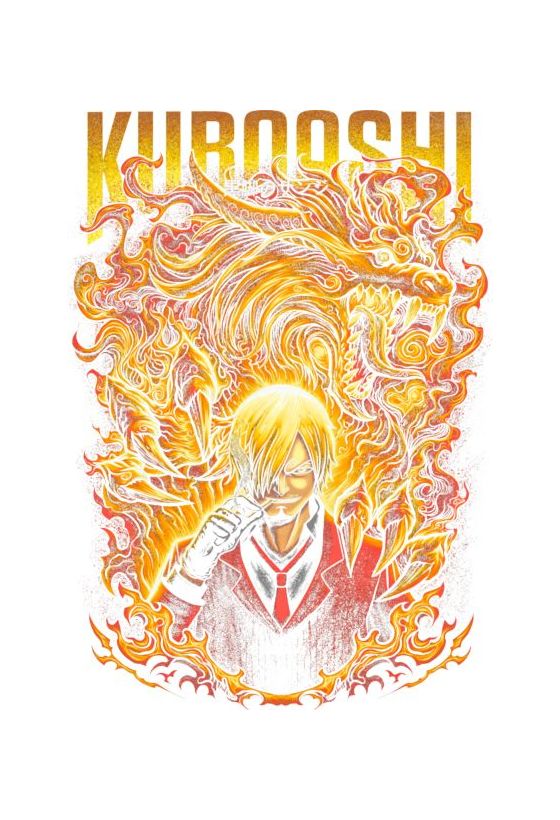 Σχέδιο του Sanji με τσιγάρο και δράκο από φλόγες πίσω του, σε δυναμική σύνθεση.