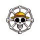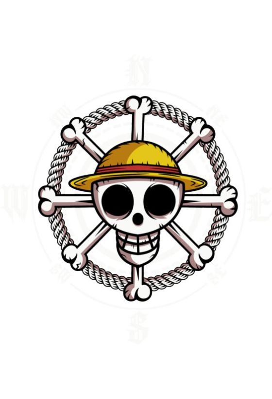 Έμβλημα Straw Hat Pirates Jolly Roger: κρανίο με ψάθινο καπέλο σε σταυρωμένα κόκαλα, μέσα σε τριαντάφυλλο πυξίδας, σε μαύρο φόντο.