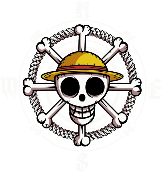 Έμβλημα Straw Hat Pirates Jolly Roger: κρανίο με ψάθινο καπέλο σε σταυρωμένα κόκαλα, μέσα σε τριαντάφυλλο πυξίδας, σε μαύρο φόντο.