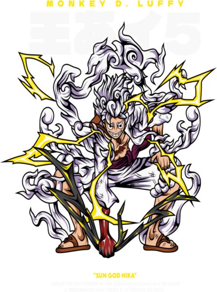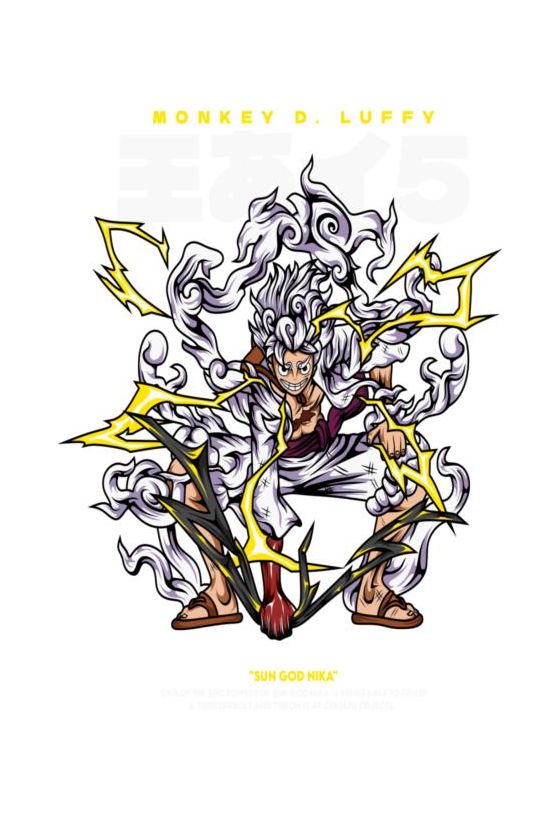 Σχέδιο του Luffy (Gear 5, Sun God Nika) με λευκά μαλλιά, καπνούς και κεραυνούς, με bold lettering.