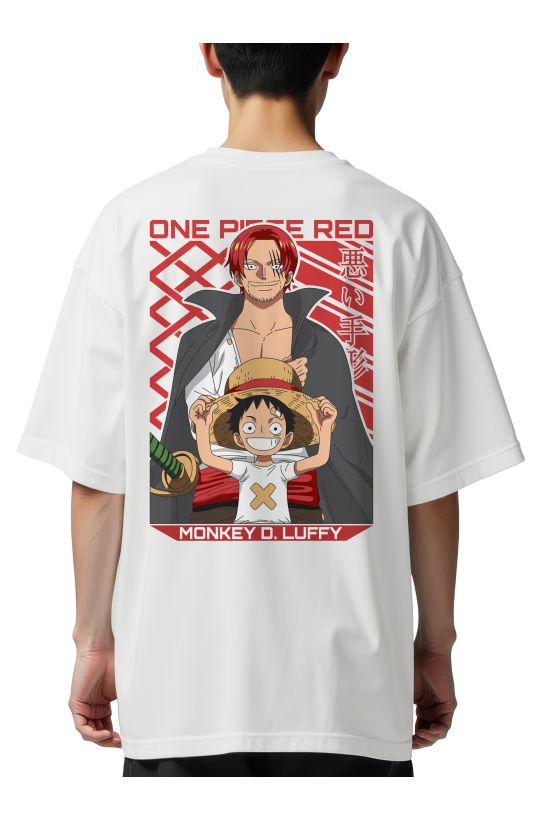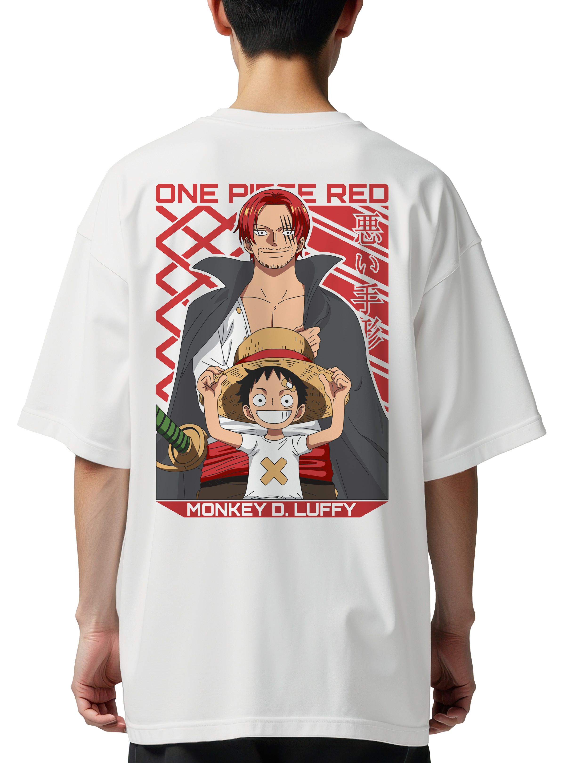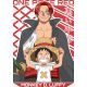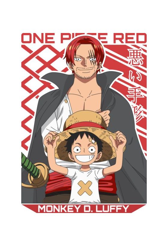 Εικονογράφηση του Shanks με νεαρό Luffy, σε κόκκινο-μαύρο φόντο με το κείμενο One Piece Red.