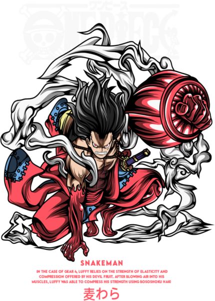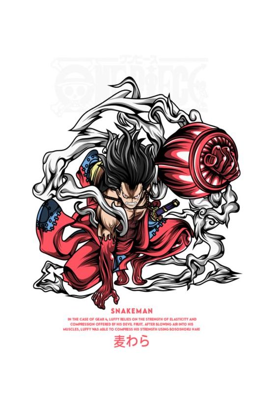 Εικονογράφηση του Luffy (Gear Fourth Snakeman) σε μάχη, με λευκό ατμό και δυναμική πόζα.