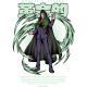 Σχέδιο του Monkey D. Dragon με μωβ κοστούμι, πράσινο μανδύα και εφέ αέρα, σε δυναμική στάση.