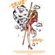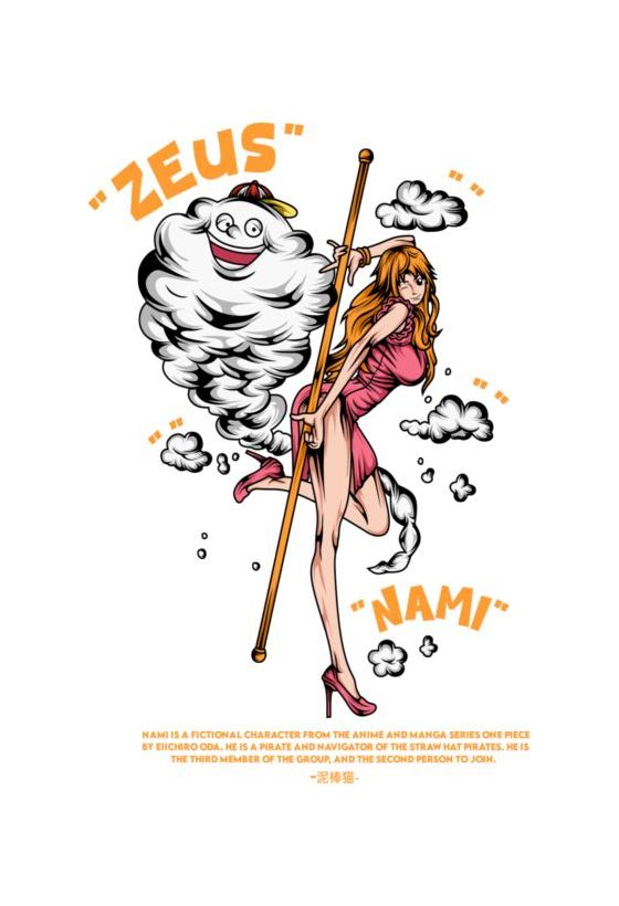 Εικονογράφηση της Nami με το Clima-Tact και τον Zeus, σε μαύρο φόντο με κείμενο Nami και Zeus.