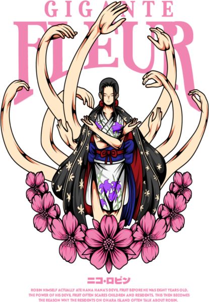 Σχέδιο της Nico Robin με την ικανότητα Gigante Fleur, περιτριγυρισμένη από άνθη κερασιάς.