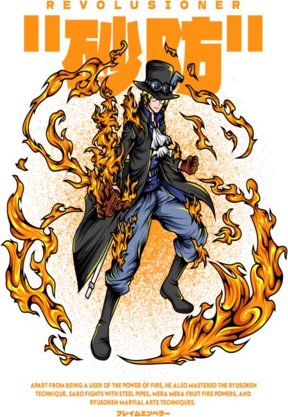 Σχέδιο του Sabo τυλιγμένου σε φλόγες από το Mera Mera no Mi, με το χαρακτηριστικό του ντύσιμο.