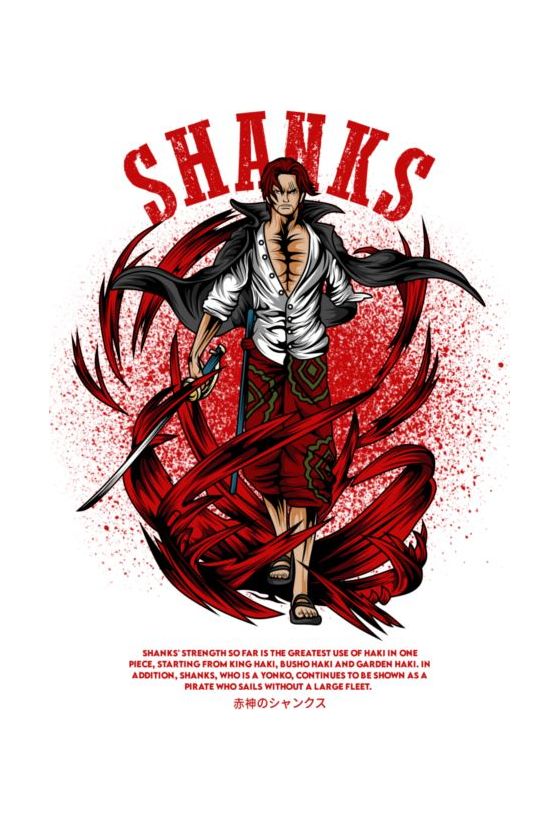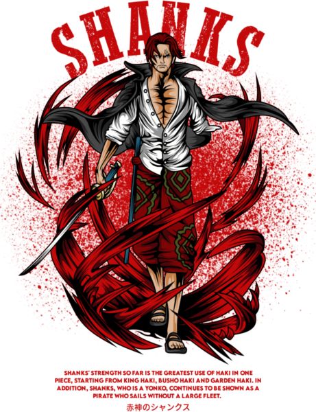 Εικονογράφηση του Shanks με σπαθί, σε κόκκινο-μαύρο φόντο, με αναφορά στις τεχνικές Haki.