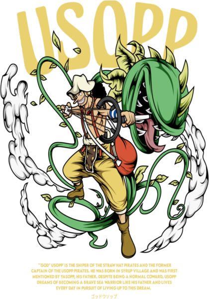 Σχέδιο του Usopp (God Usopp) με περιγραφικό κείμενο για το όνειρό του να γίνει γενναίος πολεμιστής της θάλασσας.