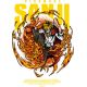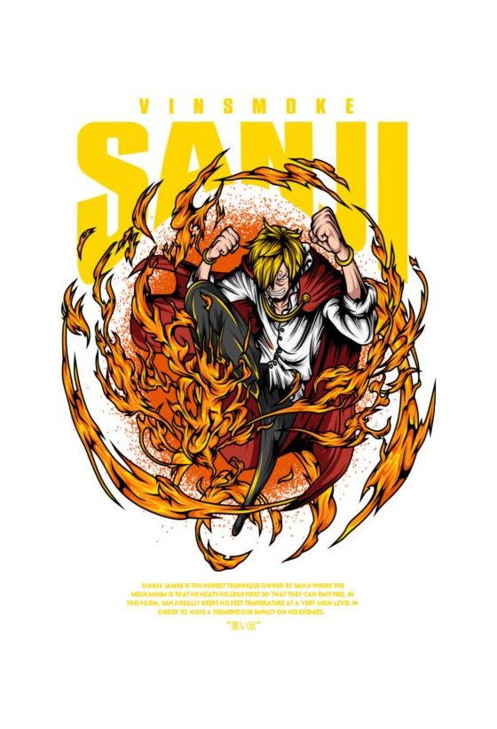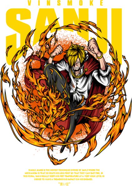 Σχέδιο του Sanji με τη τεχνική Diable Jambe, τυλιγμένος σε φλόγες, με bold lettering Sanji.