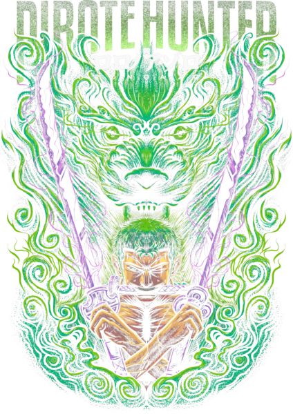 Roronoa Zoro με τρία σπαθιά και αύρα δράκου, κείμενο "PIRATE HUNTER".
