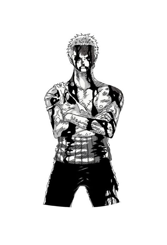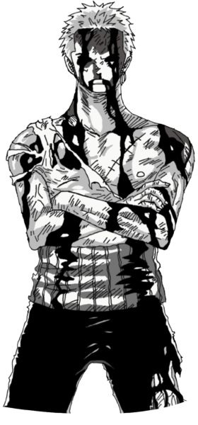 Ο Roronoa Zoro τραυματισμένος, καλυμμένος με σκοτεινή ουσία, με σταυρωμένα χέρια. Έντονη έκφραση και κουρελιασμένα ρούχα.