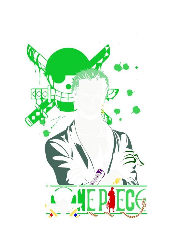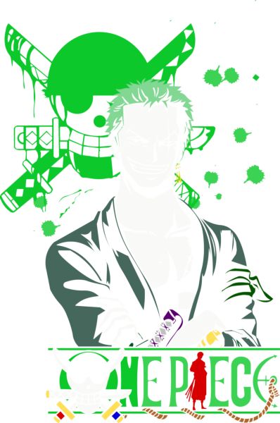 Ο Roronoa Zoro με σταυρωμένα χέρια και χαμόγελο, σε πράσινο-μαύρο φόντο με τη δική του Jolly Roger. Λογότυπο One Piece στο κάτω μέρος.