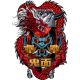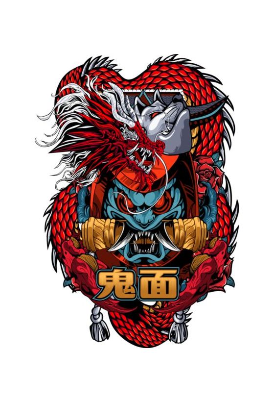 Κόκκινος δράκος, μπλε μάσκα Oni και γκρι Kitsune, με τριαντάφυλλα και ιαπωνικό κείμενο "Oni Mask".