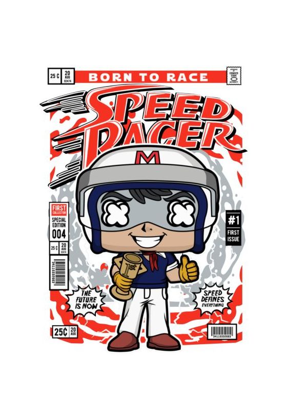 Speed Racer σε chibi στυλ με τρόπαιο, κόμικ εξώφυλλο με τίτλο "Born to Race".