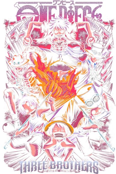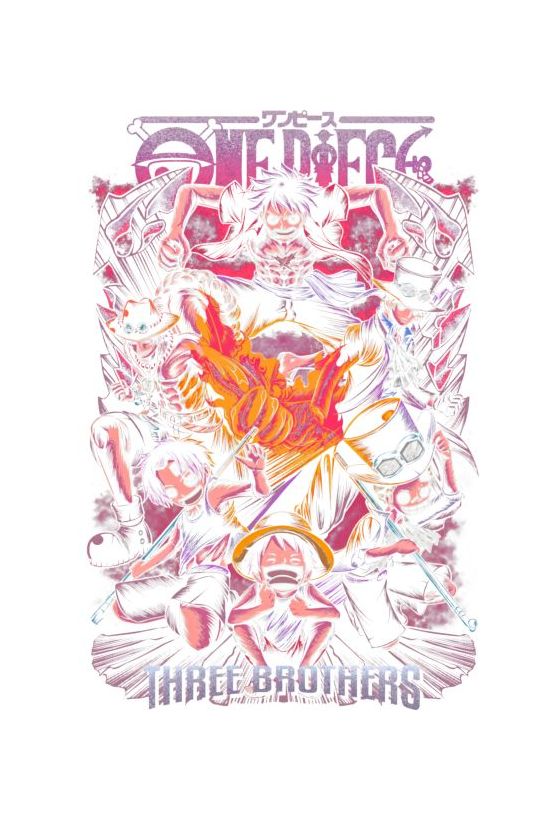 Εικονογράφηση "Three Brothers" με Luffy, Ace και Sabo σε δυναμικές πόζες, δίπλα οι παιδικές μορφές τους.