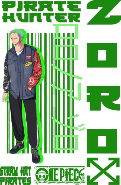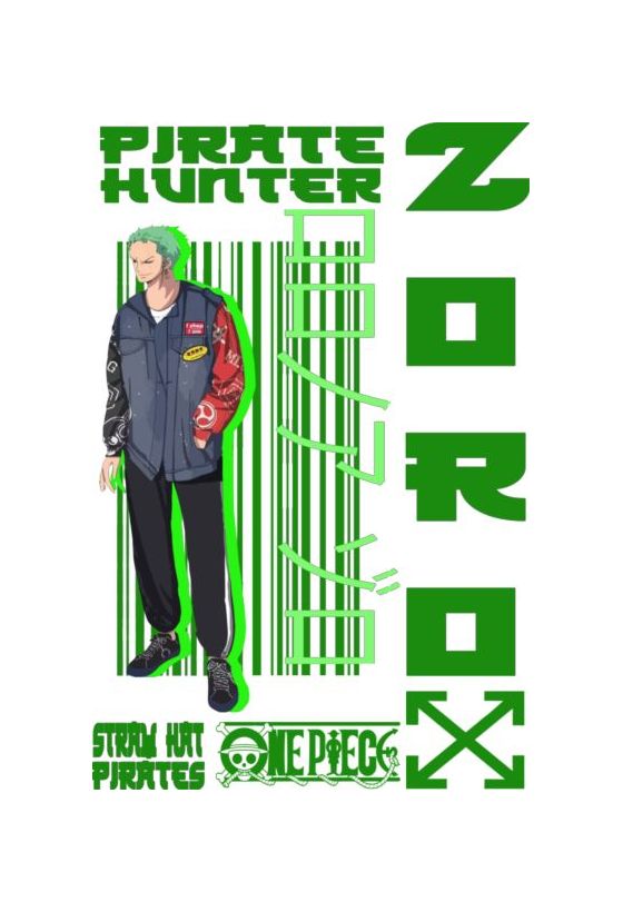 Καλλιτεχνική απεικόνιση του Roronoa Zoro από το One Piece σε streetwear στυλ, με τζιν μπουφάν, πράσινο κείμενο PIRATE HUNTER και barcode γραμμές σε μαύρο φόντο.
